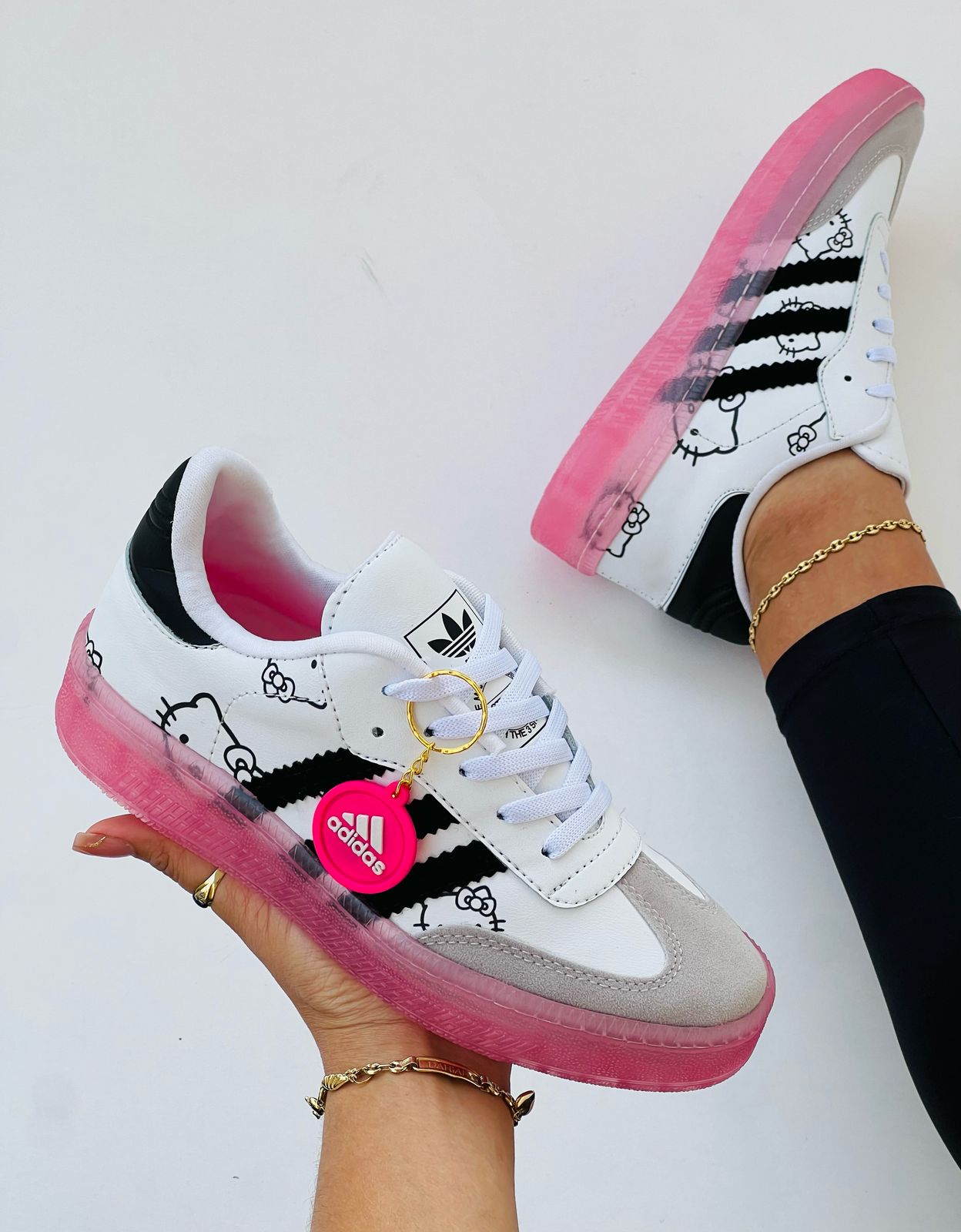 Los Adidas Hello Kitty. Combinan el encanto icónico de Hello Kitty con la calidad y estilo de Adidas. Su diseño exclusivo destaca por detalles cosidos que aportan un acabado artesanal y único. Confeccionados en materiales que ofrecen comodidad y durabilidad para el día a día, haciendo de cada paso una declaración de originalidad y estilo.